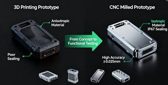 Figure 2: Functional prototype comparison shows CNC milling provides isotropic material properties and IP67 sealing, critical for reliable IoT hardware testing.